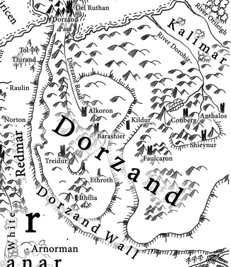 Of the elven cities in Jarazand, Anthalos was the furthest east and closest to Kalimar, standing atop a mighty flat-topped hill at the head of the Dorohir Valley. Shieynur was further south, perched atop a high ridge and commanding wide moorlands and mountain pastures that were sheltered from the worst weather by the imposing highlands to the north. Faulcaron lay much further west, enclosed in a range of precipitous mountains, and its folk were the most secretive and insular of the elven settlements in Dorzand. Rúnburg was situated at the northern edge of Jarazand, where the plateau began falling away to the north in long waves of descending hills. Rúmidoroen, although built in the great rift valley between the two plateaus, was still reckoned as belonging to Jarazand.