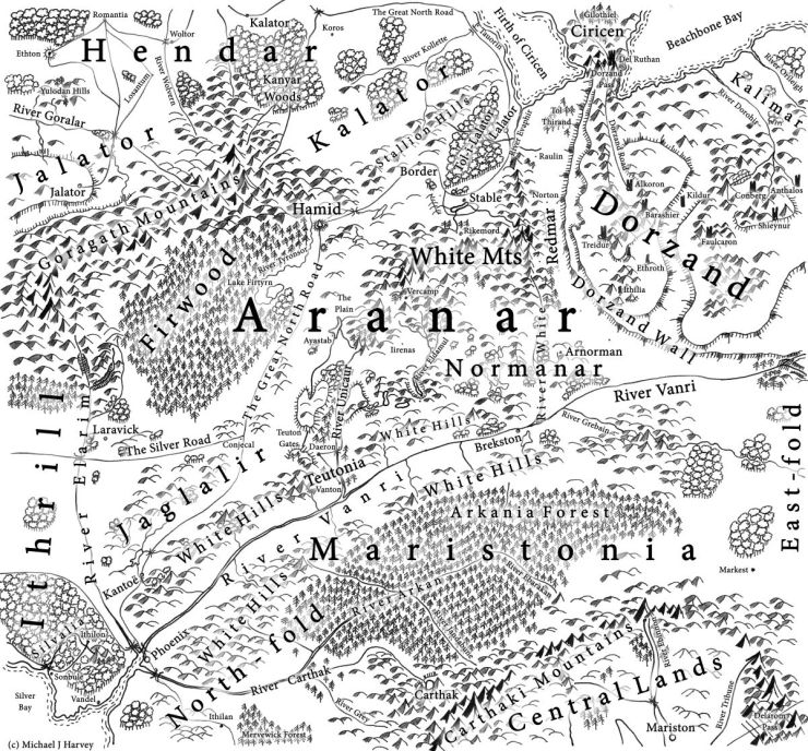 A larger community of Avatar also settled in the western part of the country, refusing to cross the Elarim with Lancearon into Ithrill. It was this community which spread across the hilly country of Jaglalir and from whom came the first rulers of Aranar. In the Second Chapter Jaglalir and the White Lands became the two main principalities in the region.