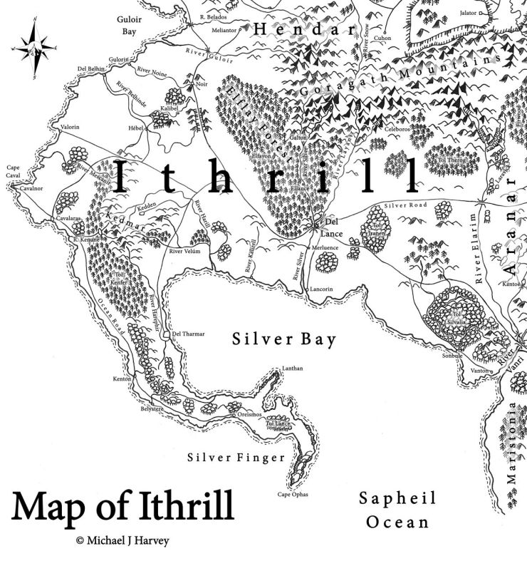 Enclosed within the curve of the Silver Finger is Silver Bay, otherwise known as the Ithrillian Sea. Extending from the noble city of Del Tharmar in the west to the mouths of the Vanri, it is a huge inlet and provides a long, sandy coastline whose ports look south to trade with Maristonia, whereas the rockier western coast, north and south of the westernmost point at Cape Caval, is oriented rather to Hendar in the north.